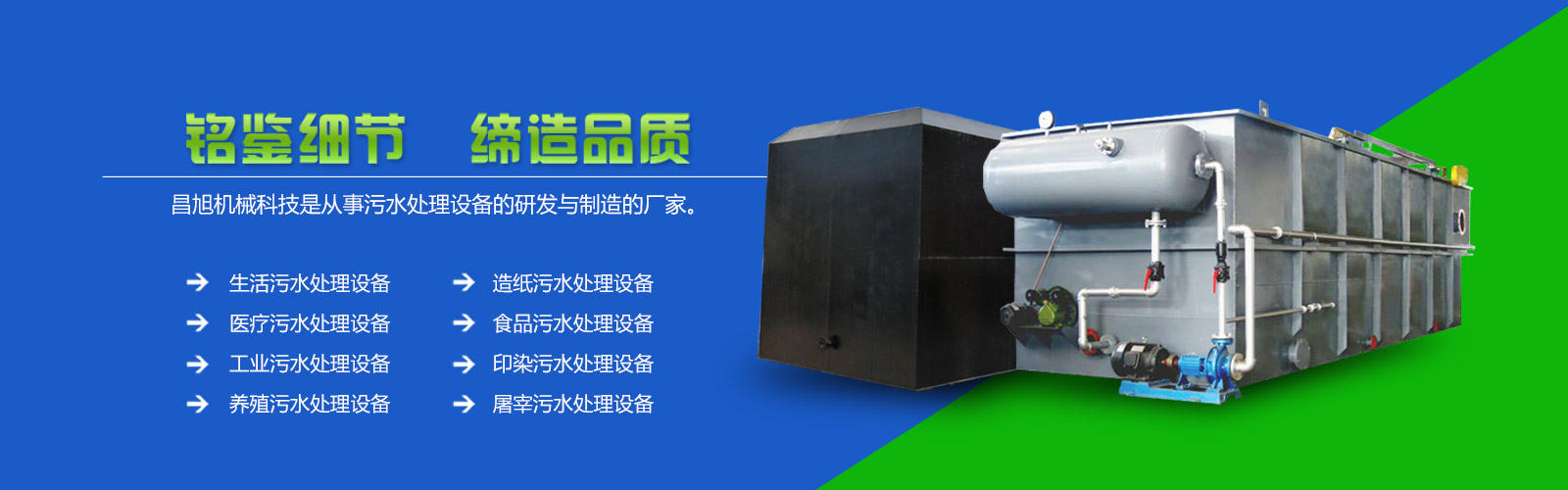 多年来,公司服务于石油、化工、造纸、制药、食品、淀粉、冶金、电力、煤炭、屠宰、印染等领域的工业污水和生活市政污水的处理工程设计,施工及技术咨询等领域。我公司主要从事水处理设备生产的专业厂家,主要有地埋式污水处理设备,一体化净水设备,MBR膜生物反应器,涡凹气浮机,高效浅层气浮机,带式脱水机,格栅除污机,二氧化碳生成器,刮吸泥机等污水处理设备。起重一体化污水处理设备,高浓度一体化污水处理设备,一体化生活污水处理设备,屠宰污水设备,煤矿污水处理设备,一体化全自动净化等多个系列环保产品畅销国内市场,并且一体化生活污水处理设备远销国外市场。